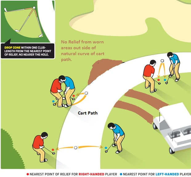Relief is only for areas that are made specifically for the purpose of carts and does not include worn areas to the sides of the natural curve of the path.  Nor does it include areas worn from maintenance vehicles. Best judgement must be made during play by the majority of the group playing and may not be brought to the committee for ruling.   Remember it is up to each competitor to protect the field.